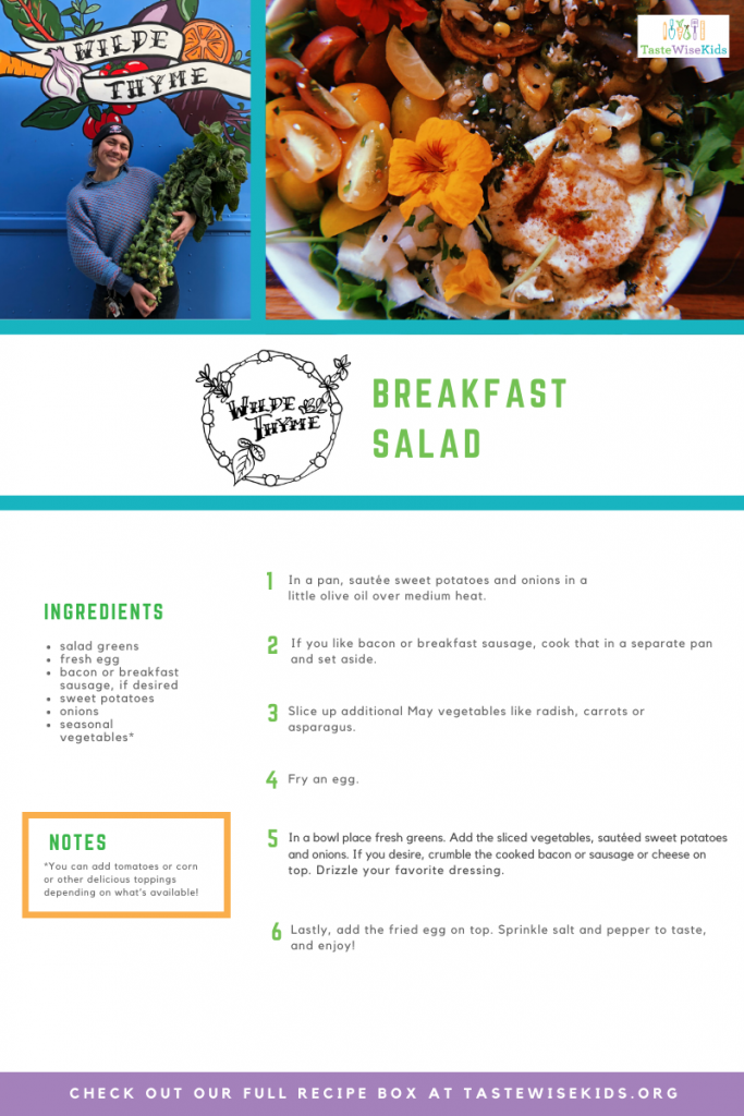 Chef Kiah Gibian, chef and owner of Wilde Thyme Food truck, is a huge lover of salads. She loves to eat greens in all sorts of different ways. One of her favorite ways to eat salad is for breakfast! She loves to start her day with something savory, but you can eat this Breakfast Salad for lunch or dinner too. You can make this salad lots of different ways, mixing in your favorite salad ingredients, the best part is adding a fried egg on top! Start with fresh greens as the base, add some sautéed sweet potatoes and onions, maybe some cheese or bacon if you eat that, any other fresh vegetables you might have (shredded carrot or tomato), adding a fried egg on top, and poof! You have breakfast in a salad! One of her secrets to making it taste so good is using fresh and local ingredients.